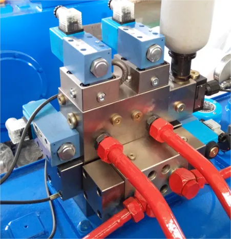 采用獨(dú)立的液動(dòng)換向閥,使閥組油路塊的油孔設(shè)計(jì)得到了進(jìn)一步簡化。中信重工 E6161B/E6160B 型液壓站的液壓閥組的應(yīng)用如圖7 所示。