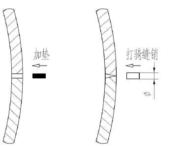 ①重 點檢查兩半卷筒的接合面部位是否出現縫隙。如果縫隙沿筒殼內外均勻,則可以從外側向縫隙填補薄鋼板,并將其固定牢靠;如果縫隙沿筒殼內外不均勻,一般是外側頂緊,造成貼緊的假象??梢詮耐鈧仍诮雍峡p部位打騎縫銷并可靠固定,將縫隙處撐緊。