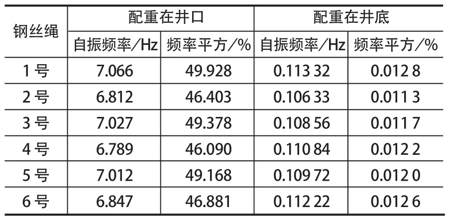 鋼絲繩張力測試在 2 種工況下進行,分別是配重在井口時和配重在井底時。測試時,提升機要保持靜止狀態,用小錘依次敲擊鋼絲繩,并用測振儀器記錄數據。從非驅動側到驅動側的鋼絲繩編號為 1~6,如圖 2 所示。鋼絲繩振動測試結果如表 1 所列。