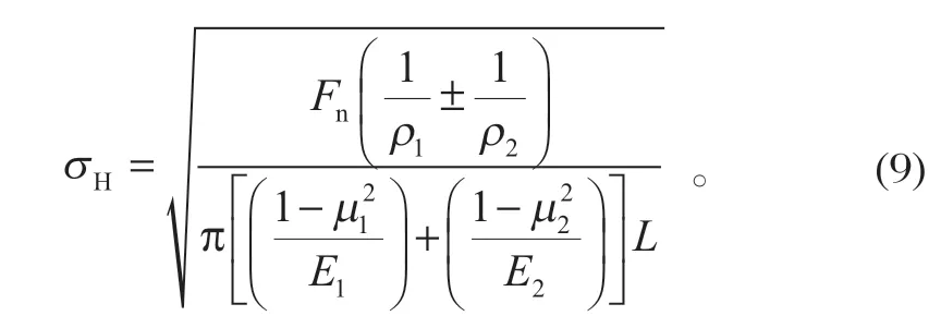 3.2 理論計(jì)算Hertz 接觸理論是研究疲勞、摩擦及任何有接觸體相互作用的基本理論。在齒輪嚙合過(guò)程中,將齒輪的接觸問(wèn)題等效為兩圓柱面的接觸問(wèn)題。赫茲接觸應(yīng)力