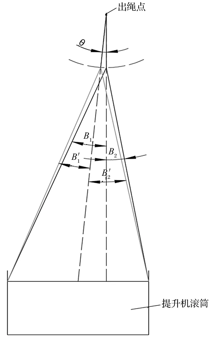 礦井提升機的鋼絲繩偏角問題是影響提升系統鋼絲繩安全運行的重要因素之一,如果鋼絲繩偏角過大,將加大鋼絲繩與天輪輪緣的磨損,降低鋼絲繩的使用壽命,磨損嚴重時,甚至還會發生斷繩事故,造成不可挽回的損失。